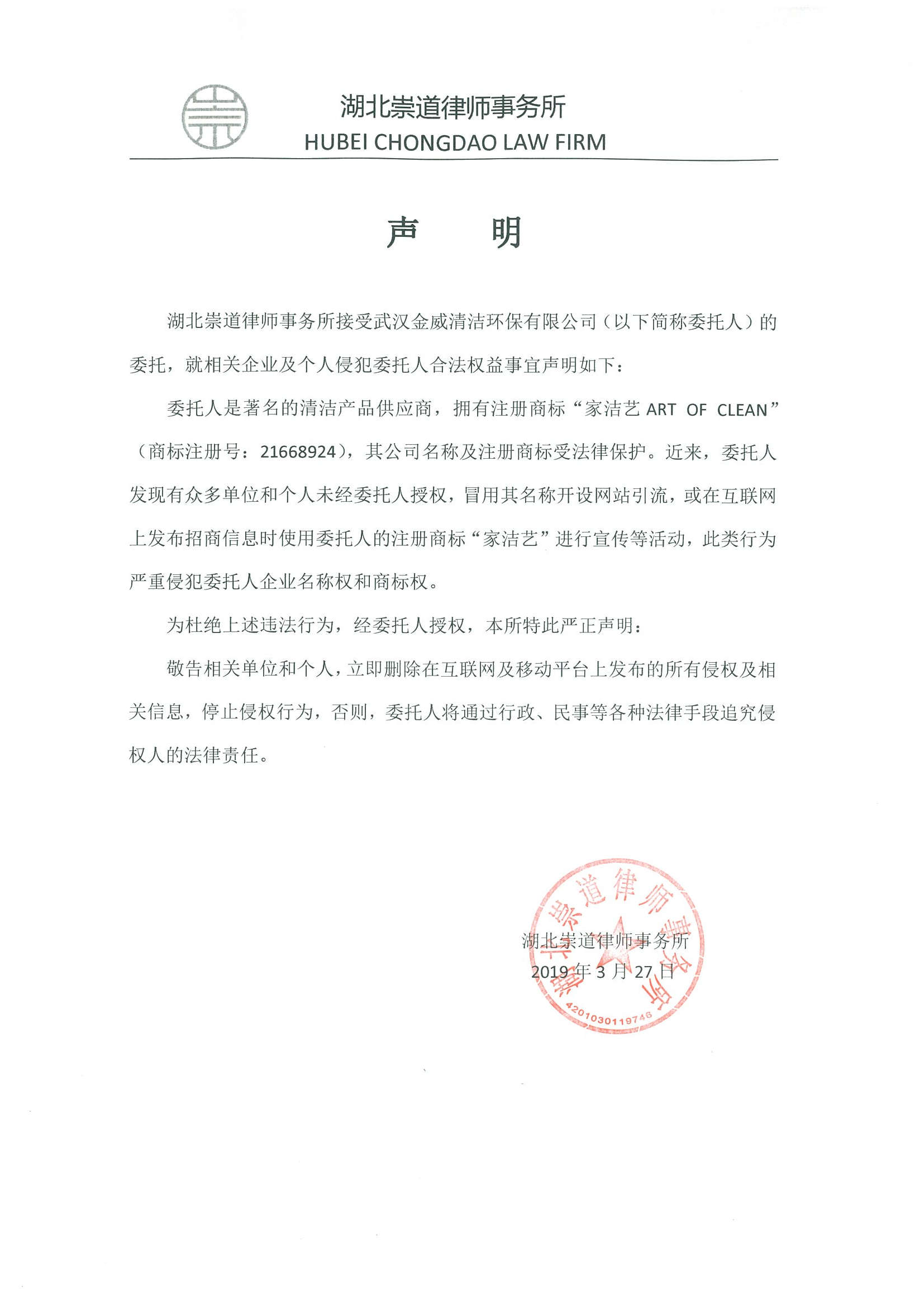 為了打擊仿冒侵權(quán)行為,維護(hù)家潔藝的品牌聲譽(yù)和合法權(quán)益,我司已委托律師事務(wù)所發(fā)表一下律師聲明: