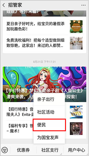 第二步:公眾號頁面點擊菜單“社區(qū)支行→便民”進入,點擊第二張圖片“家電清洗福利”圖進入;