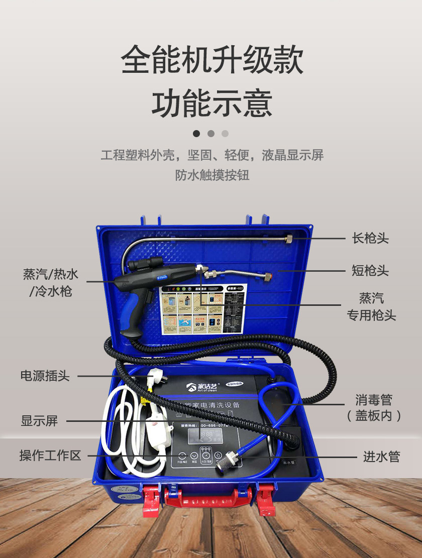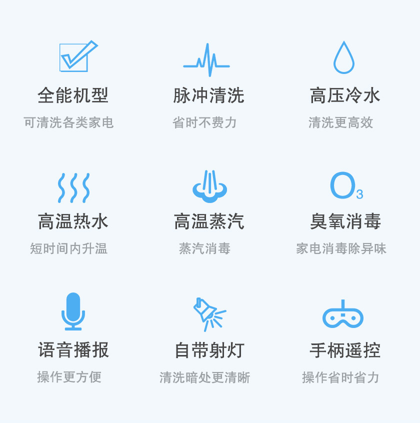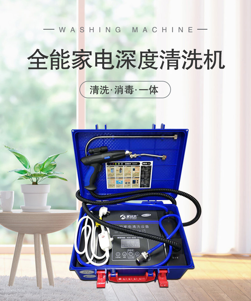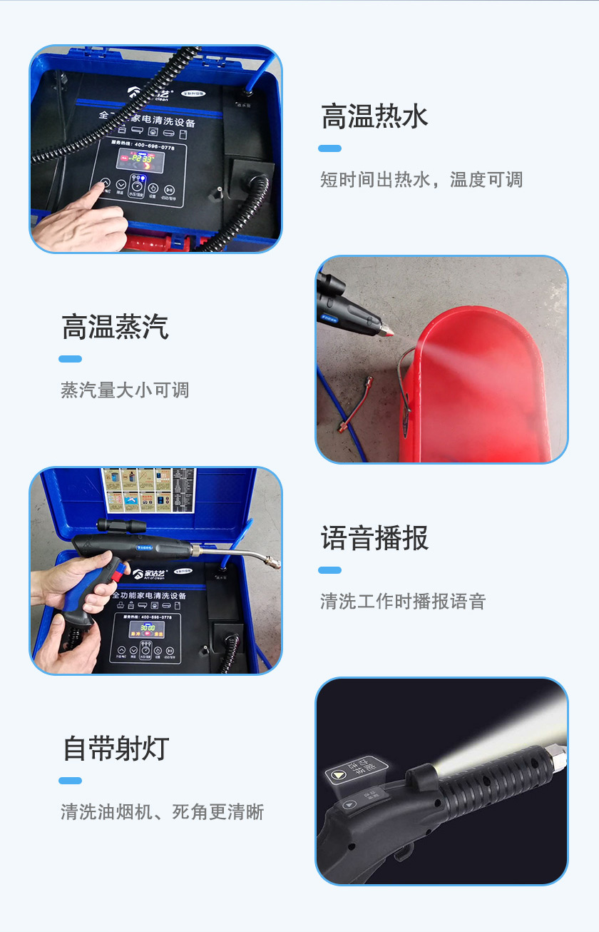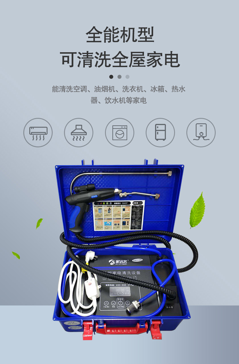 家潔藝全能家電深度清洗機(jī),自帶語音播報(bào)、射燈、手柄遙控操作等功能,大大提高了清洗家電的方便性和高效性。更有冷水、熱水、蒸汽、消毒、脈沖清洗,5種模式任意切換,能清洗全屋家電,包括空調(diào)、油煙機(jī)、洗衣機(jī)、冰箱、熱水器、飲水機(jī)、微波爐等家電,提現(xiàn)了家電清洗機(jī)一體性、全能性的特點(diǎn)。
