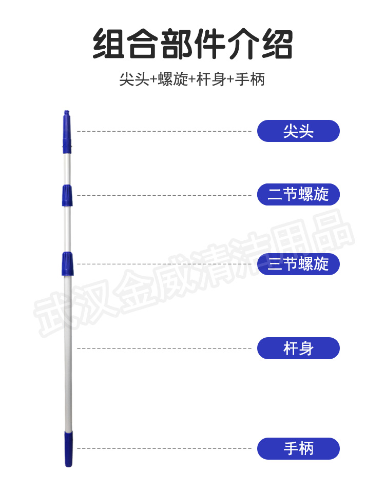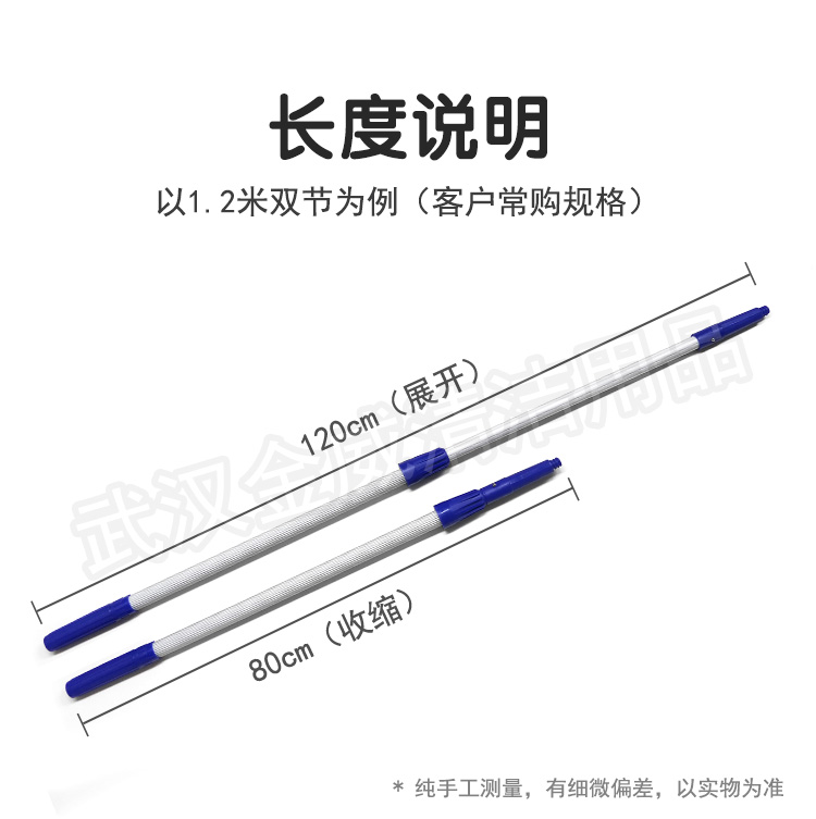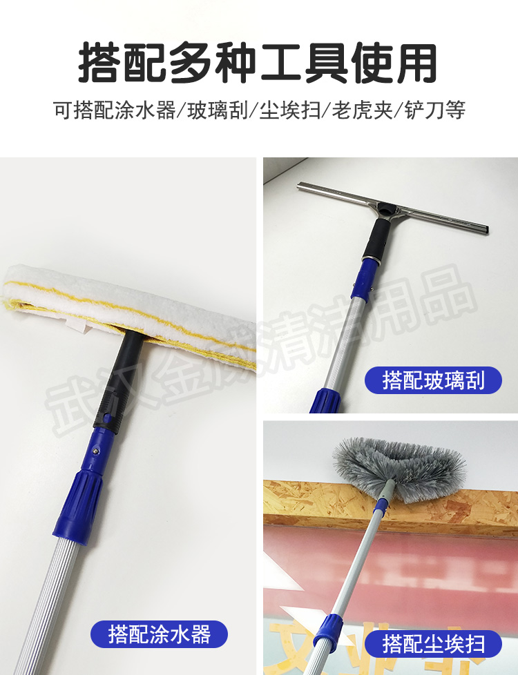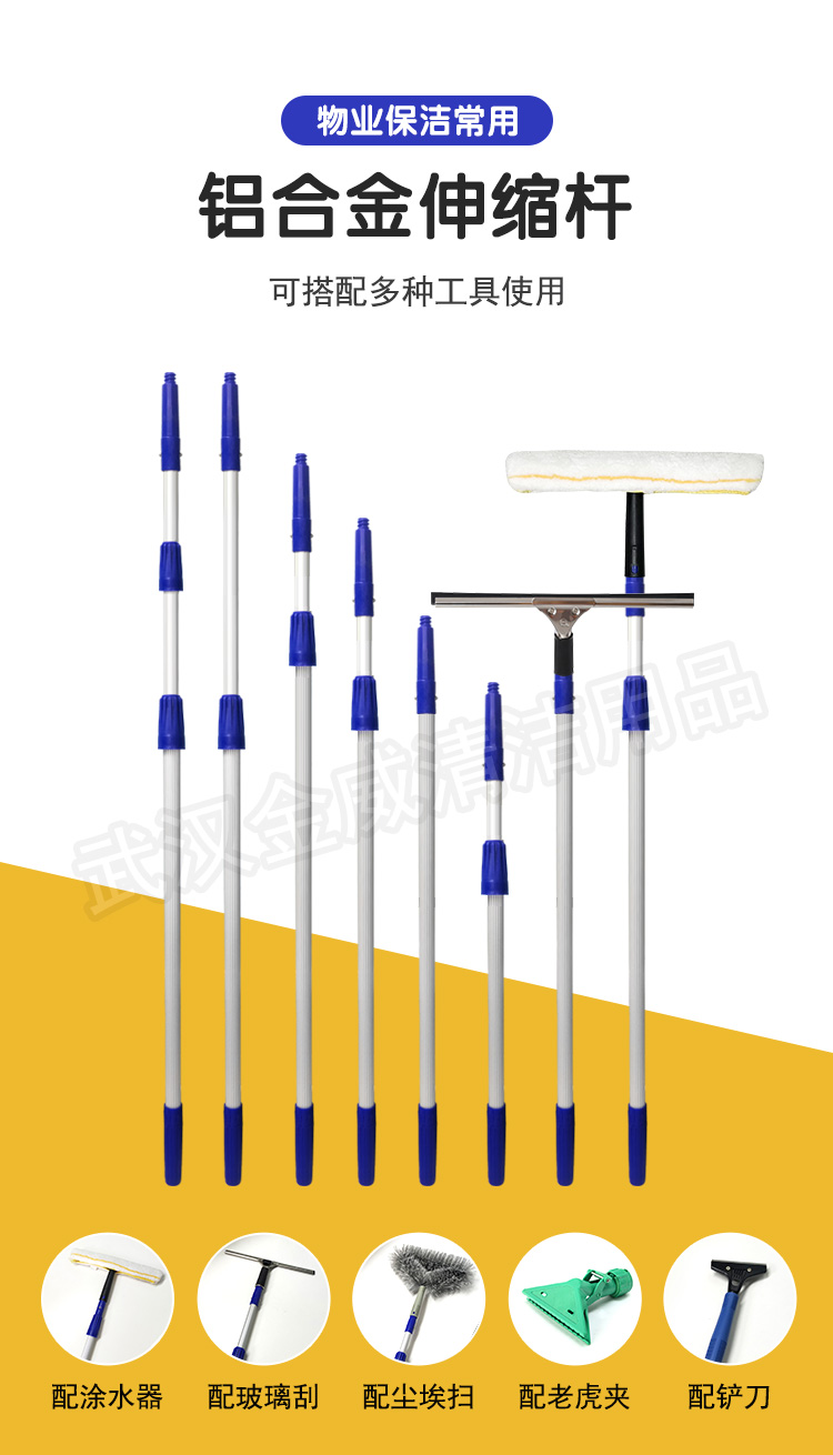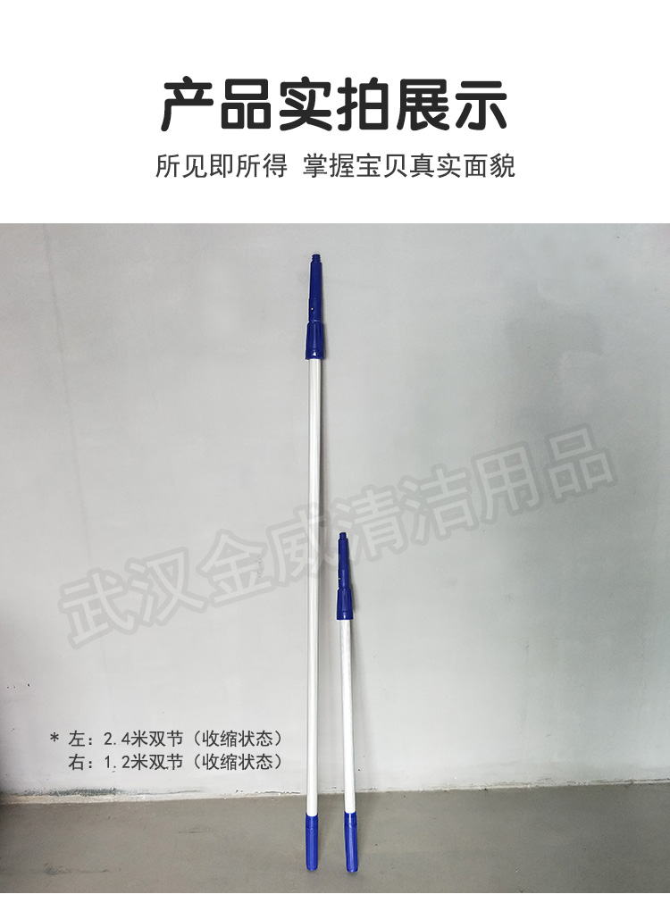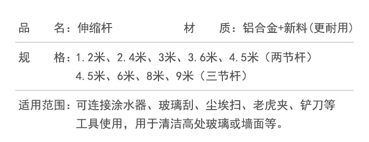 【優(yōu)點:】鋁合金加厚管壁,更結實;可收縮桿身,旋轉可調節(jié)高低,攜帶、工作更方便;新料制作,非再生,更nai用,無異味;尖頭設計,搭配玻璃刮、涂水器等,即插即用;防滑有凸出紋路,防滑設計。
